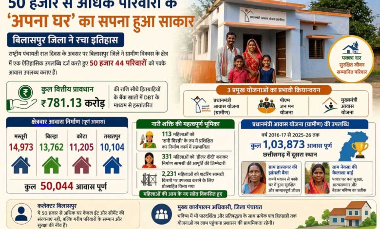 राष्ट्रीय पंचायती राज दिवस के अवसर पर बिलासपुर जिले ने ग्रामीण विकास के क्षेत्र में एक ऐतिहासिक उपलब्धि दर्ज करते हुए 50 हजार 44 परिवारों को पक्के आवास उपलब्ध कराए हैं। जिला प्रशासन द्वारा योजनाओं के क्रियान्वयन में पारदर्शिता और समयबद्धता को सर्वाेच्च प्राथमिकता दी गई। कुल 781.13 करोड़ रुपये की राशि सीधे हितग्राहियों के बैंक खातों में डीबीटी के माध्यम से हस्तांतरित की गई, जिससे बिचौलियों की भूमिका समाप्त हुई और कार्यों में तेजी आई।